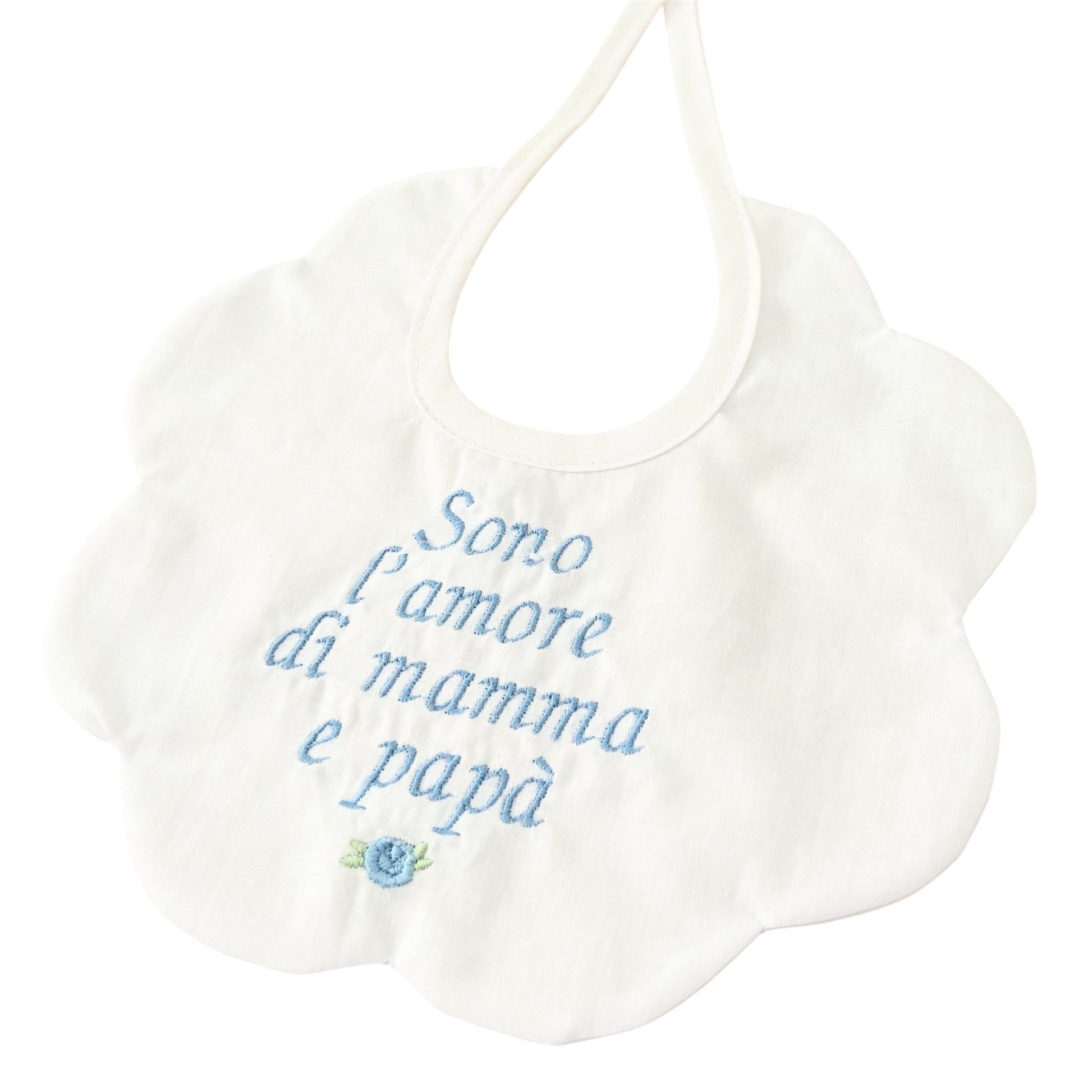 Questo bavaglino "sono l'amore di mamma e papà" è l'accessorio perfetto per la pappa del tuo bimbo.