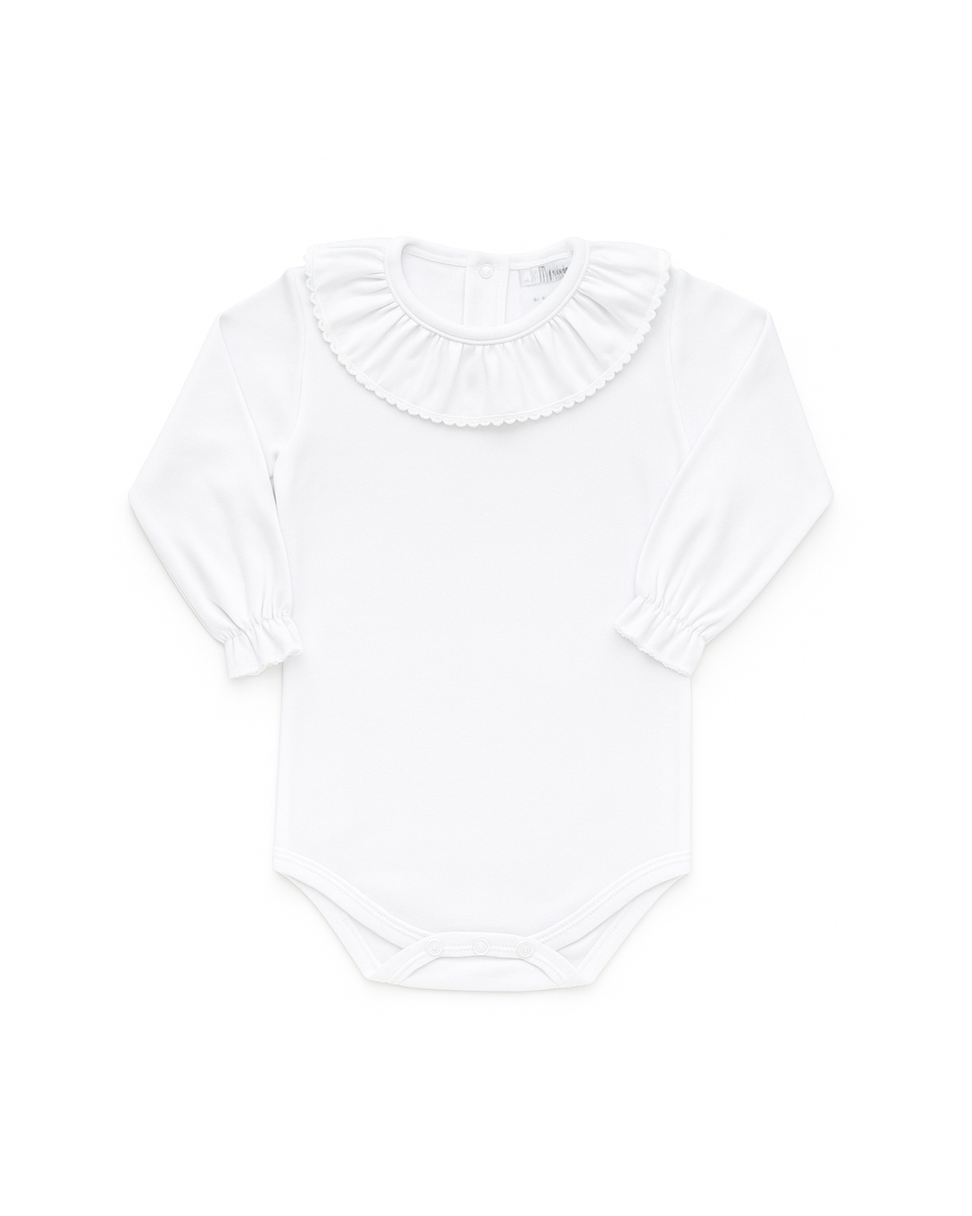Il body collo volant manica lunga è il capo ideale per la tua bimba grazie al suo particolare dettaglio elegante. Realizzato con un collo con volant e bordino rosso, questo body è perfetto per ogni occasione. Confortevole e di alta qualità, rende ogni outfit unico e raffinato.