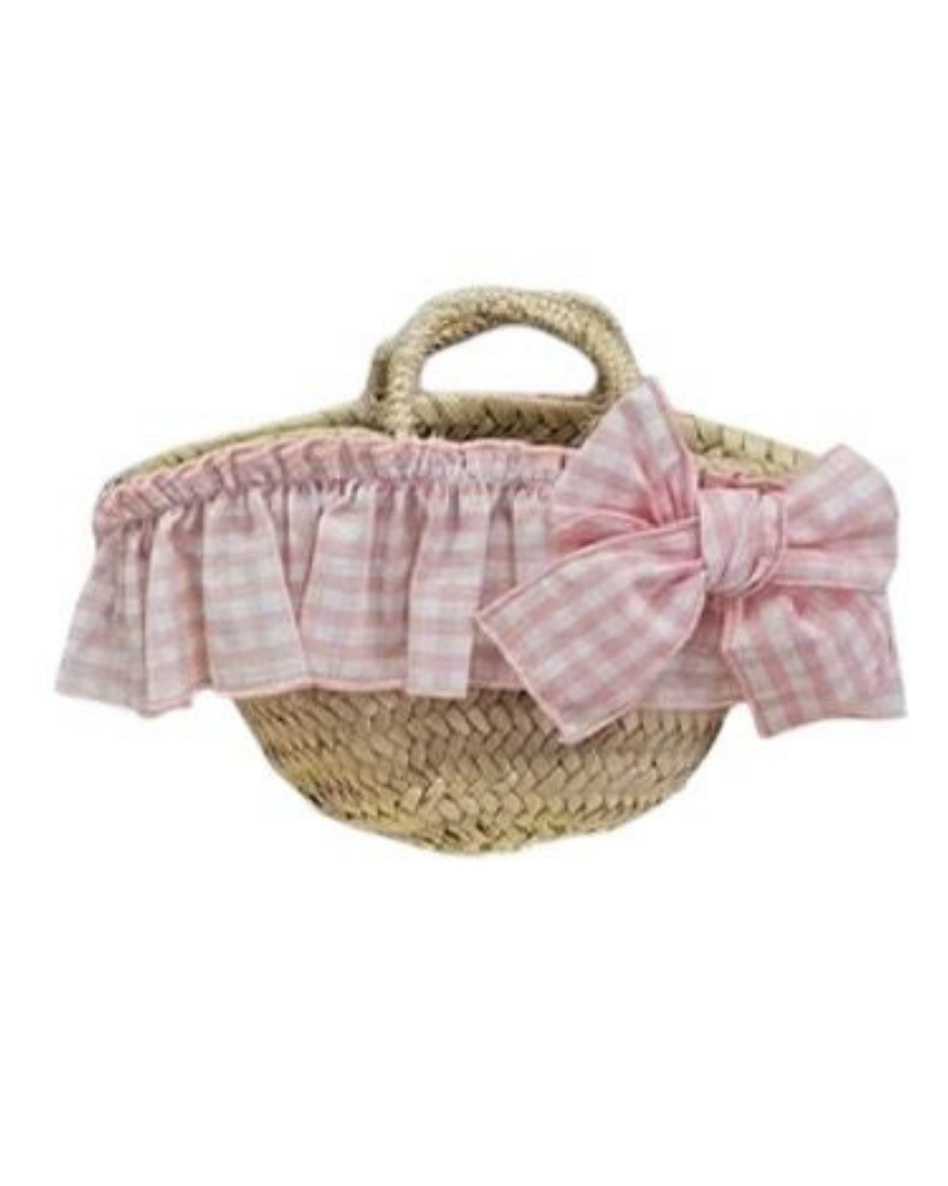 Realizzata in paglia naturale intrecciata a mano, questa borsetta è impreziosita da una balza in tessuto vichy e da un maxi fiocco coordinato. Leggera, comoda e adorabile, è pensata per accompagnare le piccole in ogni avventura estiva: al mare, in passeggiata o a una festa speciale.