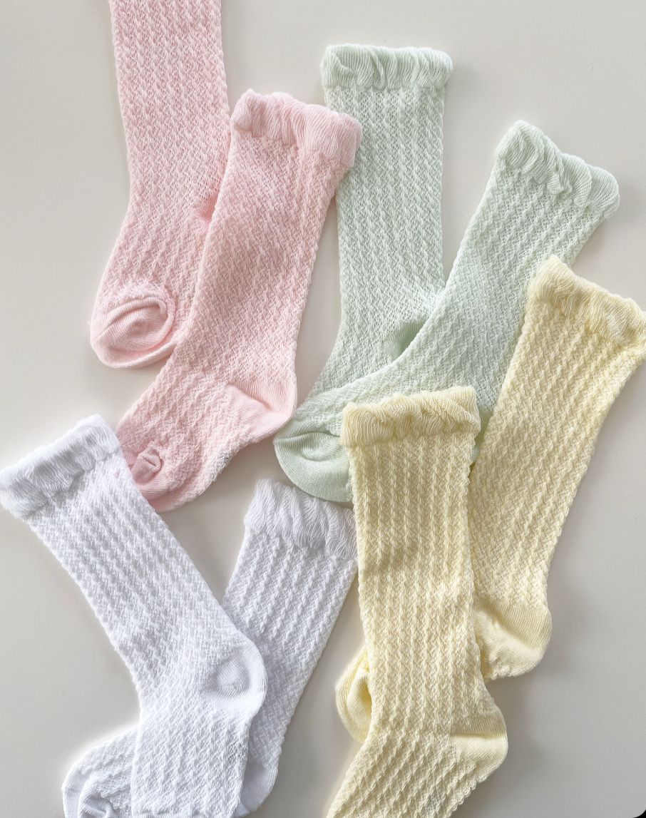 Combina l'eleganza con la comodità con i nostri calzini in filo di cotone. Perfetti per l'estate grazie ai colori pastello e alla leggerezza del tessuto. Confortevoli e delicati, ideali per ogni occasione e per la tua bimba. Un must-have per ogni guardaroba estivo.