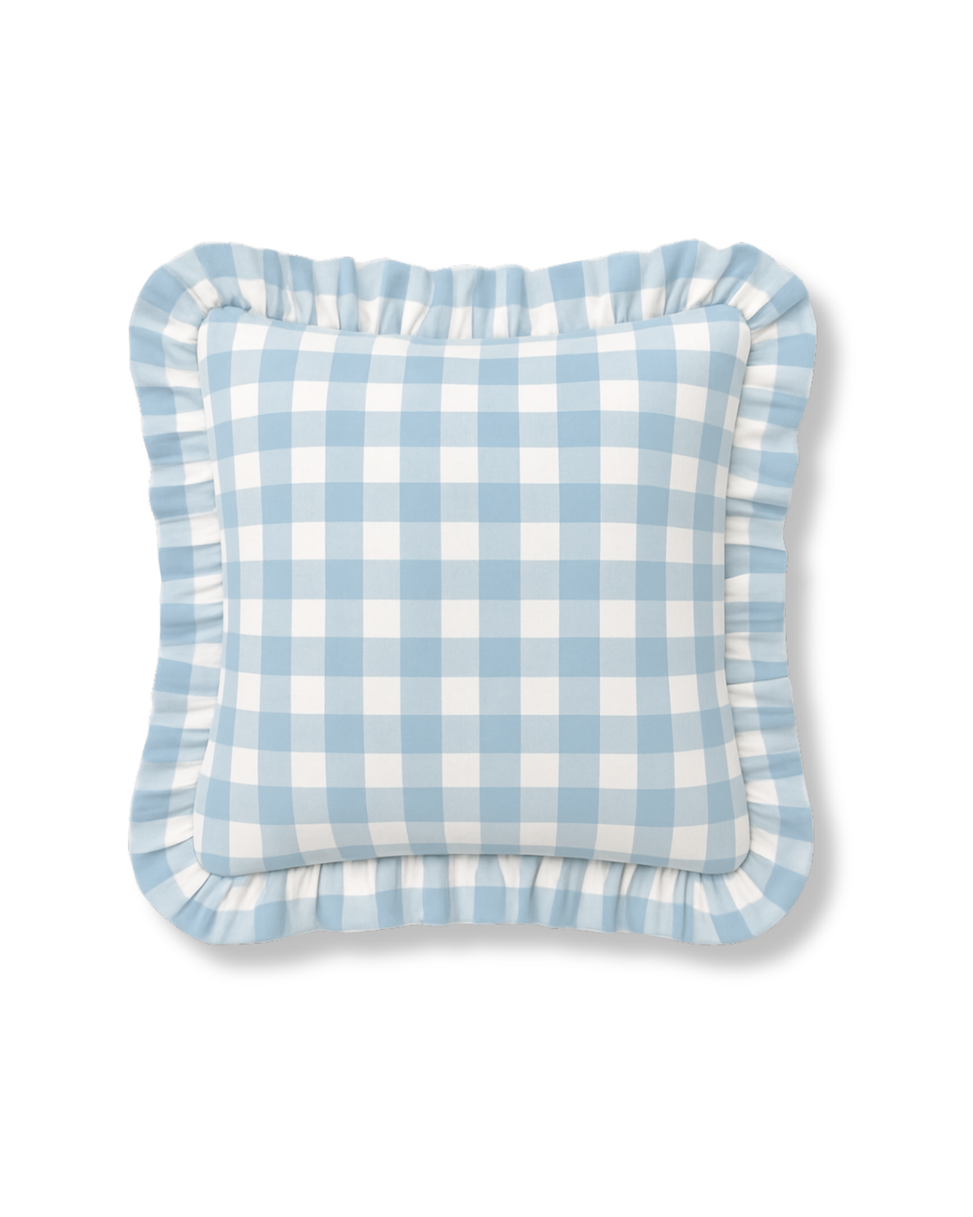 Questo cuscino, realizzato in morbido cotone con fantasia vichy rosa cipria e bianco, è impreziosito da un delicato volant tutt’intorno che ne esalta lo charme artigianale.