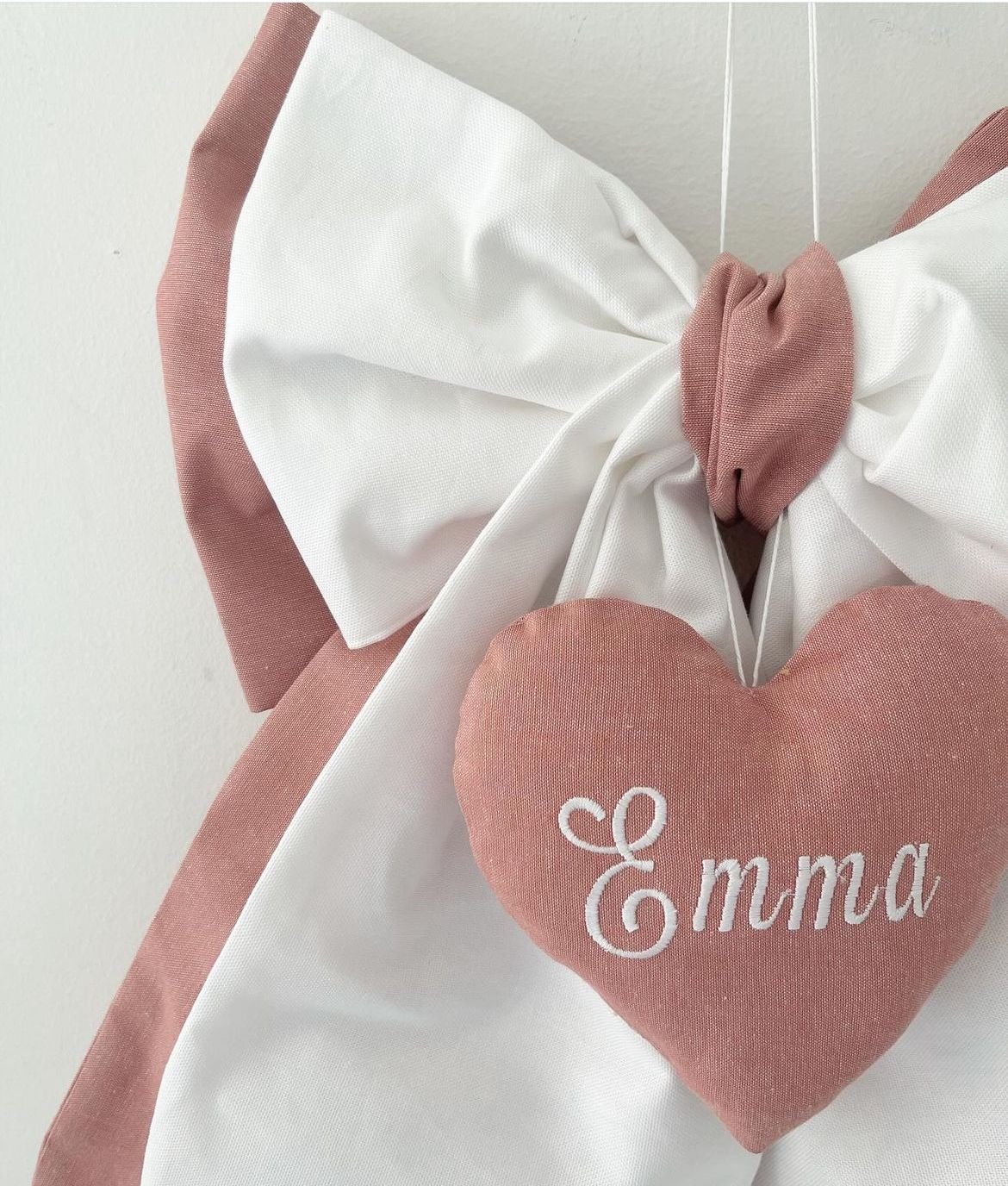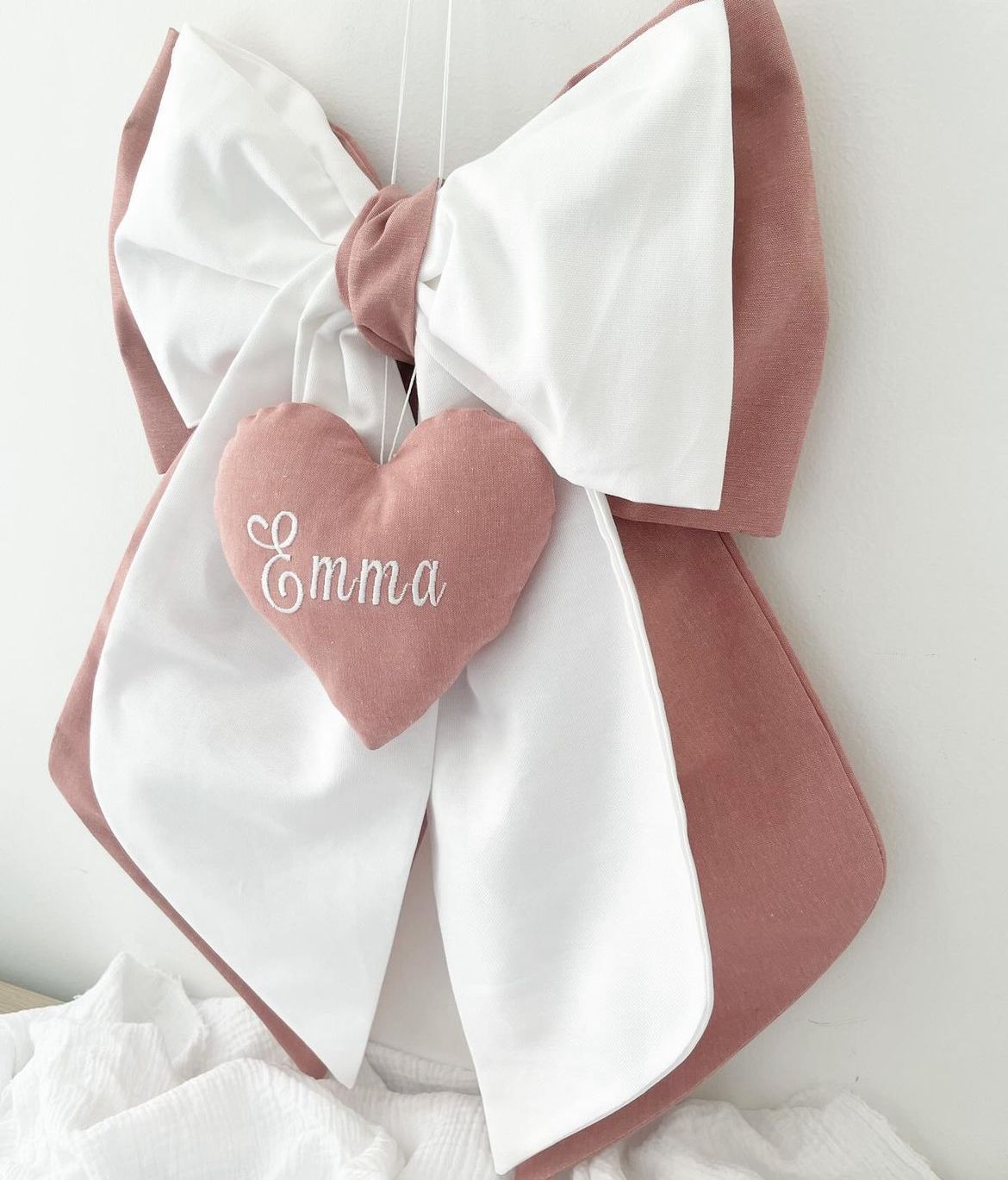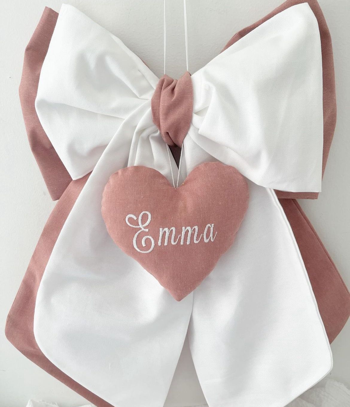 Un dolce e tenero fiocco nascita per celebrare l'arrivo del tuo bimbo, realizzato in bianco e rosa antico con cuore centrale con ricamo.