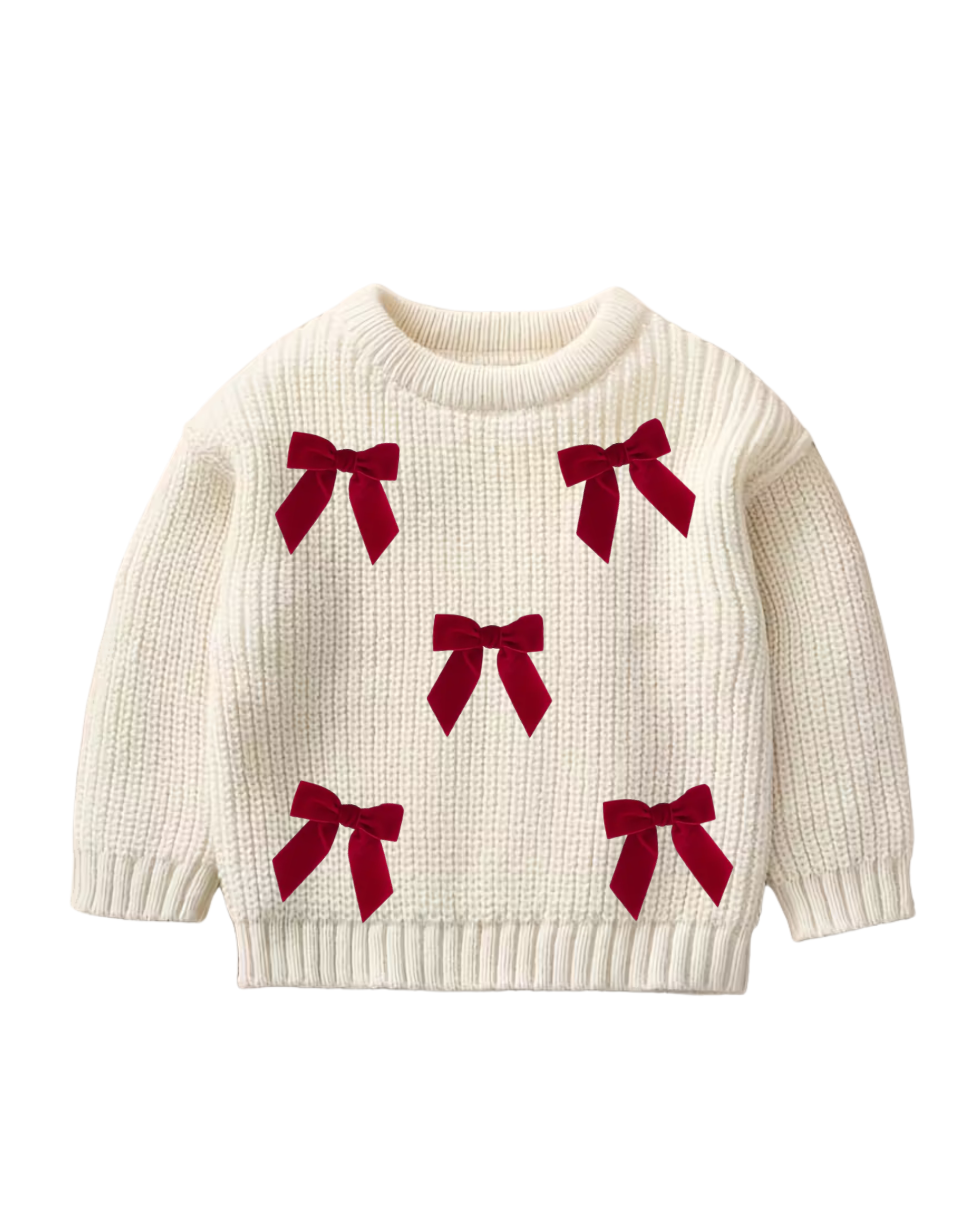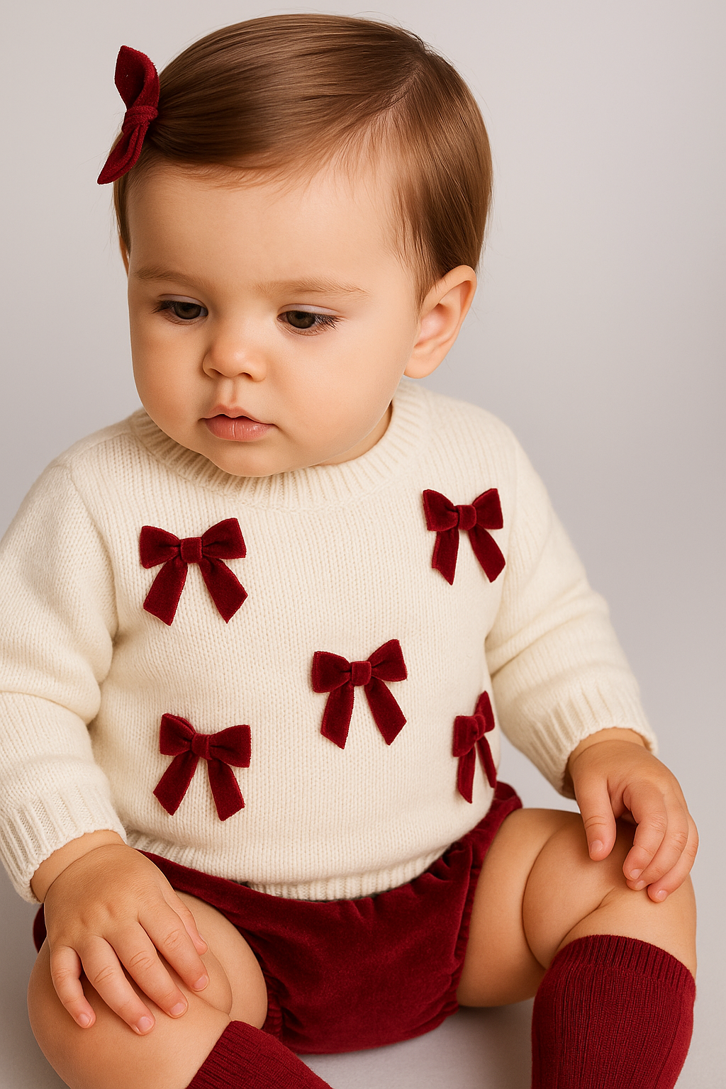 Un capo super chic, perfetto per i primi freddi. Realizzato in morbida maglia color panna, questo maglioncino è impreziosito da piccoli fiocchetti in velluto, per un tocco unico e speciale.