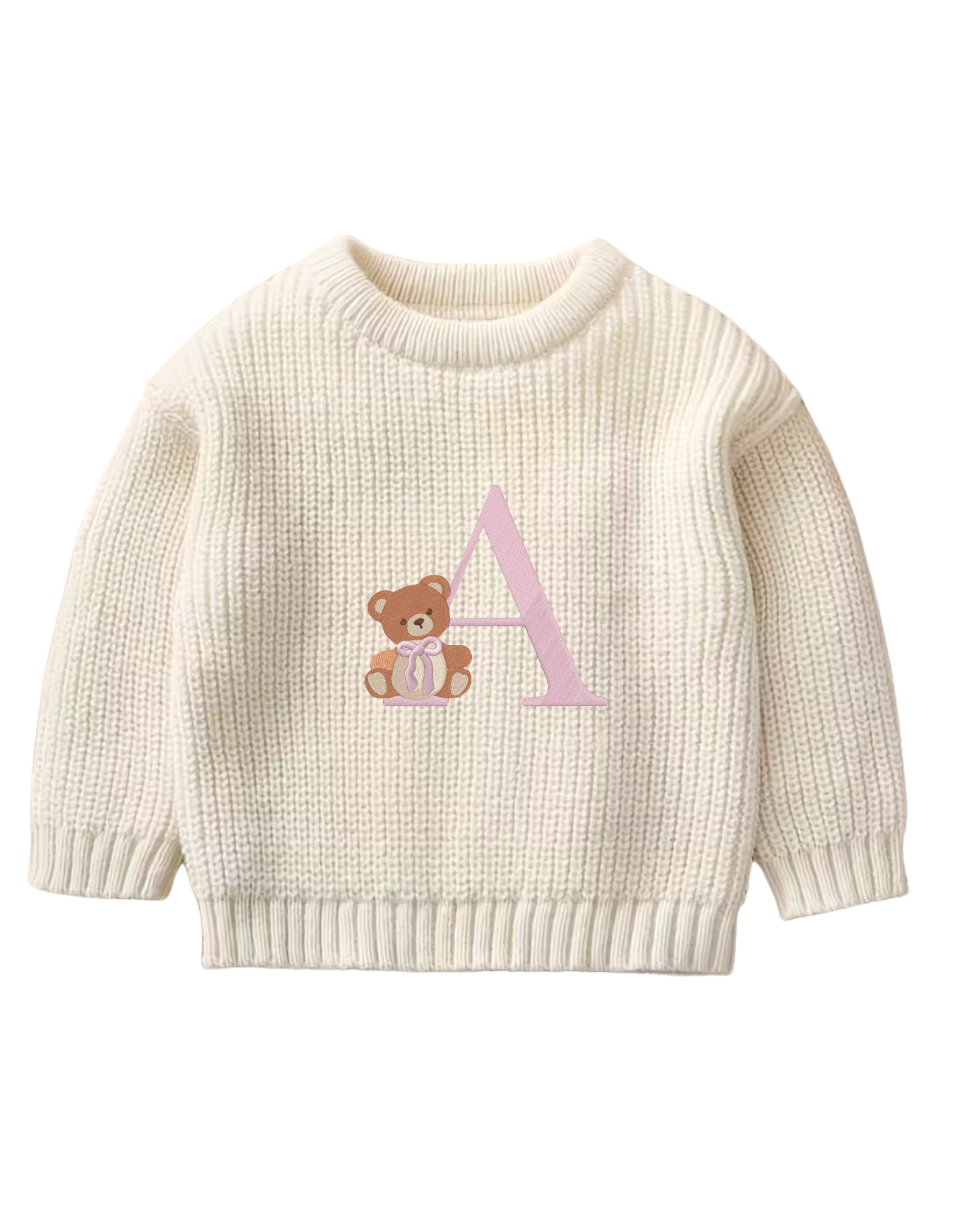 Un capo dolce e raffinato, perfetto per i primi freddi. Realizzato in morbida maglia color panna, questo maglioncino è impreziosito da un ricamo con iniziale personalizzabile e un tenero orsetto, per un tocco unico e speciale.