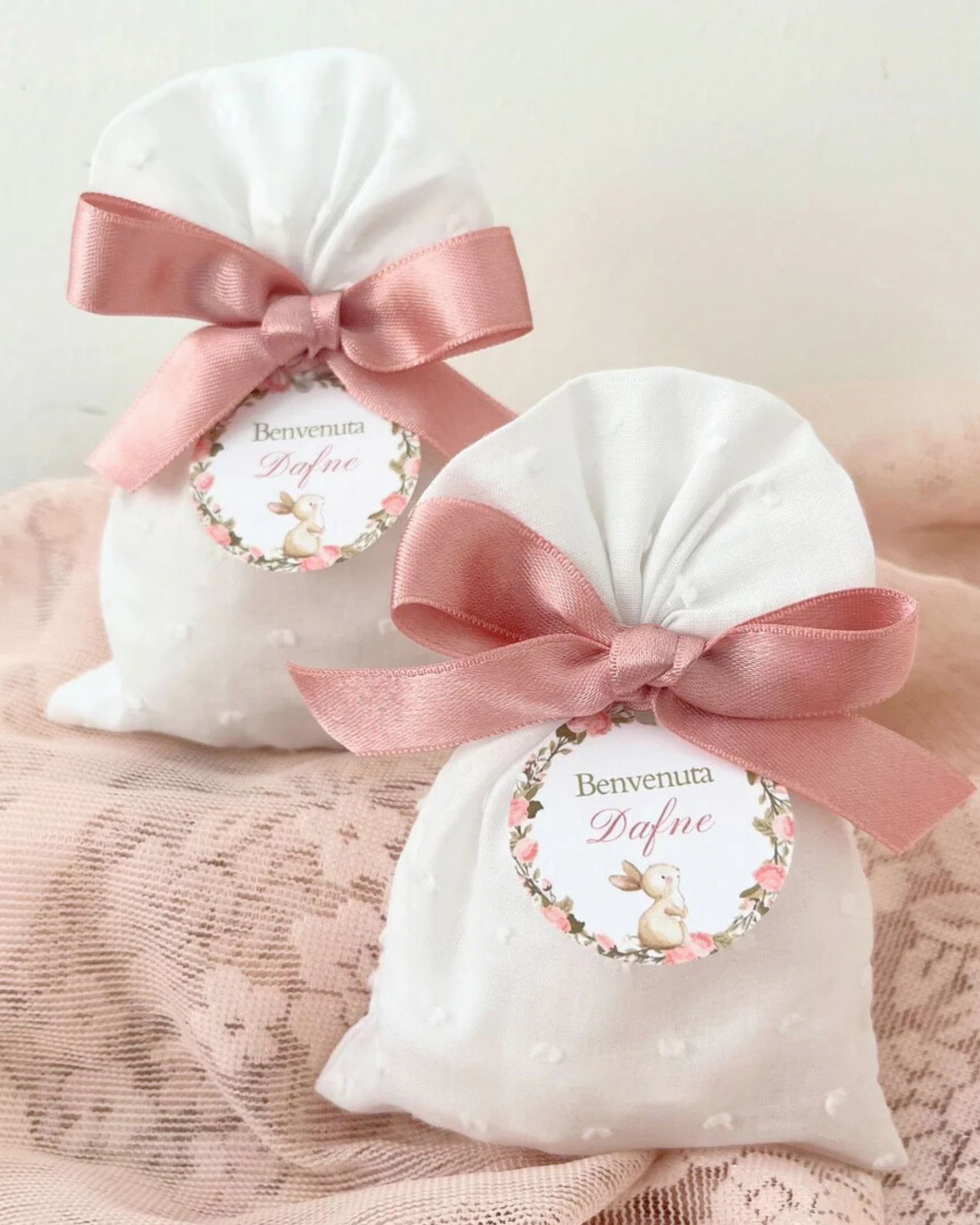 Sono personalizzabili sia per la scelta del tessuto, che per il gusto confetti e tag esterno.