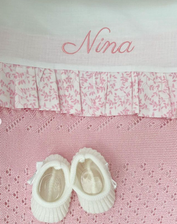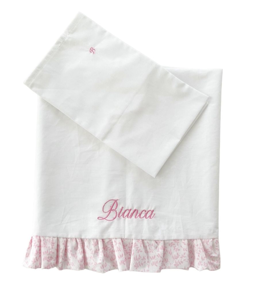 Questo set lenzuola con balza a foglioline rosa è perfetto per far dormire la tua bimba nella sua culla in tutta eleganza e comfort. Personalizzabile e disponibile in diverse misure, è l'ideale per la sua prima nanna. Morbido, delicato e completo, garantisce una nanna dolce e rilassante per il tuo piccolo tesoro.